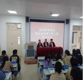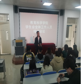 为贯彻学习《习近平致全国青联十三届全委会和全国学联二十七大的贺信》文章精神及新学期新气象,10月25日教育科学学院学生会全体成员在新综合楼210教室举行“教育科学学院学生会工作人员培训会”。本次会议由团委书记李思邈老师主讲,党总支书记朱北堂,副书记戚麒麟参席会议。
