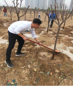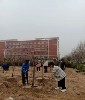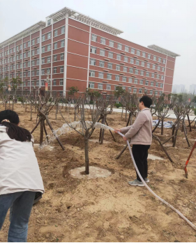 生命在于绿色,希望在于绿色。在李思邈老师的带领下,植树活动有序的进行着。无数之手,同时在这个日子紧握希望之光,一同奋斗,诠释着内心最美好的愿望。每个人都有明确的分工,有的用铲子松土挖坑、有的往里面种树苗、有的结伴去施肥浇水;李思邈老师更是不怕苦不怕累,带上手套,亲自除草,挖坑,并种下樱花树苗,他还特别强调一切事情都要按标准做事,施肥要讲究,行列要对齐等,不仅要讲究效率更要注重品质。其次,李思邈老师特意请了一名懂种植的师傅,在旁边作为指导,同学们也学习到了许多关于种植树木的知识,大家在劳动中学习,在汗水中快乐,来年春天的校园,定是樱花香满园。