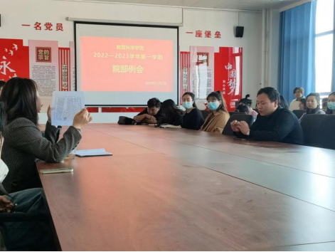 为保证我院各项工作能够顺利开展,2022年11月1日教育科学学院召开了院部例会。教育科学学院全体教职工参会,学院领导主要对教学工作进行了部署和安排,具体内容如下。