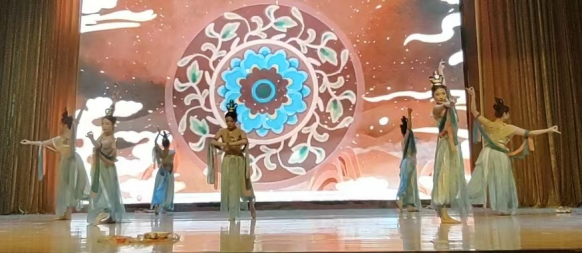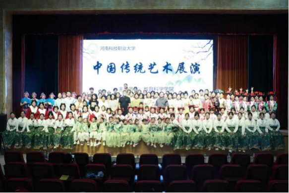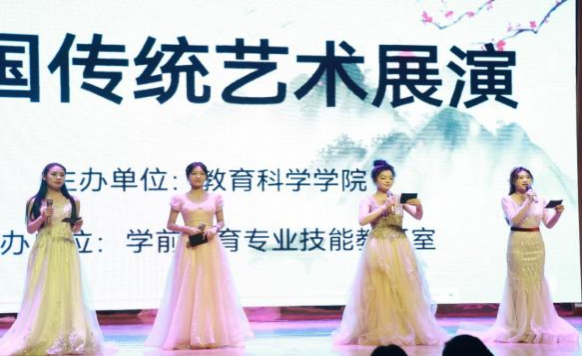 2024 年 5月21日,教育科学学院《中国传统艺术》课程教学汇报展演在校图书馆三楼演播厅举行。保卫处郭广才处长、教育科学学院姚婷婷副院长、田菲菲副院长、实训室王强主任等亲临展演现场。此次展演由教育科学学院杨盼盼老师、徐小娟老师、王强老师指导,2021 级学前教育本科学生、2023 级学前教育专升本学生 138 人,连同13 名教师子女共同参与表演,650 名来自学校的教师、教师子女及各个学院的学生参与观看。