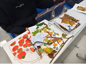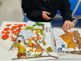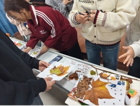 活动现场,同学们以秋叶为材,以巧思为笔,将棕褐梧桐叶和金黄银杏叶化为“霜降”图景,或在叶片上轻撒白絮模拟落霜,或用彩纸折出橙红柿果点缀枝桠,或借枯枝、书签搭配出“秋实”意象,一张张作品既藏着“万物披霜”的节气意趣,也揉进了同窗协作的温情。现场更有节气知识分享环节,大家在交流中了解霜降“进补”“赏菊”等民俗,让传统文化在实践中鲜活起来。